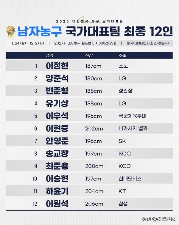 北京时间11月4日,根据韩国篮协官方社媒公示,世预赛对阵中国男篮的12人大名单,李贤重,柳基相等亚洲杯参赛球员领衔。其中身高最高内线球员为李元锡只有2米06。